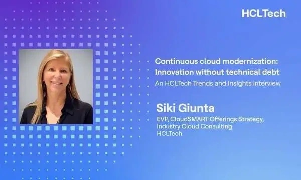 Watch video Siki Giunta, EVP, CloudSMART Offerings Strategy, Industry Cloud Consulting at HCLTech, explains how to achieve continuous cloud modernization, which is key to driving innovation without technical debt